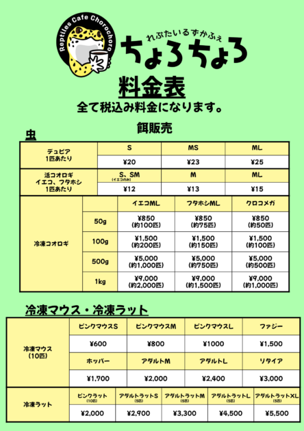 生体、餌販売 2022.07.242026.01.05 生体販売当店で販売中の動物たちです!お迎えセットを購入すればそのまま飼育することができます(^-^)生体のみの購入や見学は入場料は不要です!気になることがあればご相談ください!レオパ、フトアゴ、ニシアフ、クレス販売中です! ヒョウモントカゲモドキ お問い合わせなど気軽に各SNSや公式LINEまでどうぞ! 餌販売デュビアやコオロギ、冷凍マウスを販売しております。餌のみの購入は入場料は不要です!お気軽にお店までどうぞ!